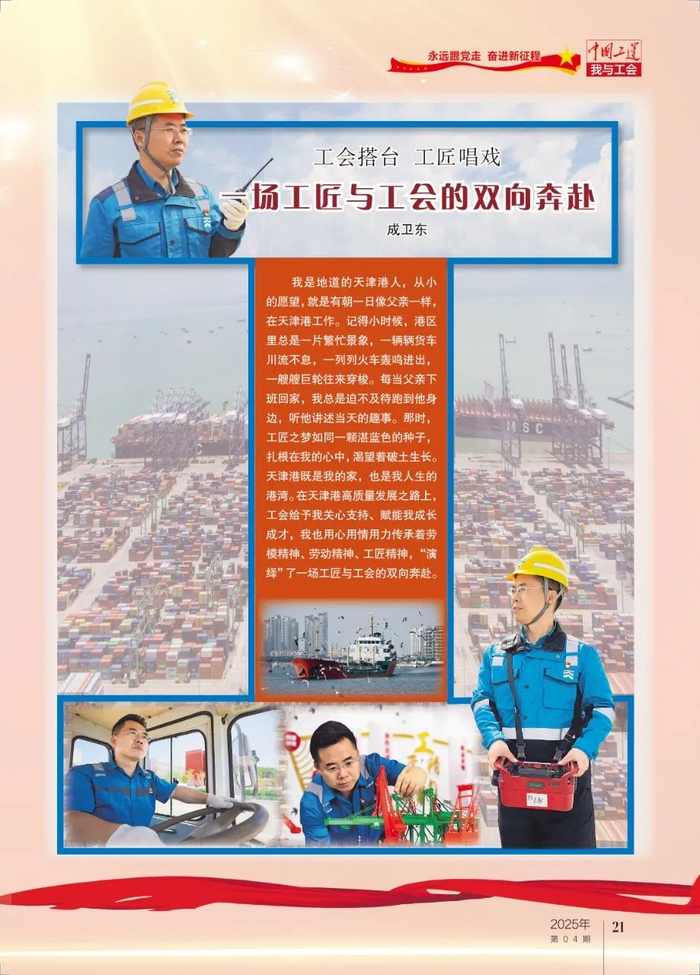 多年来,工会举办的技能比武大赛为成卫东搭建了学习技能、交流经验、展示才华的广阔舞台,也让他苦学的技能有了用武之地。他独创"倒车绝技"并获多项国家级荣誉;他成立的劳模工作室培养数百技术骨干,研发200余项技改成果创效超6000万元;作为新时代产业工人代表,他转型AI训练师助力智慧港口建设,与工会共同谱写工匠精神传承与港口高质量发展的双向奔赴篇章。