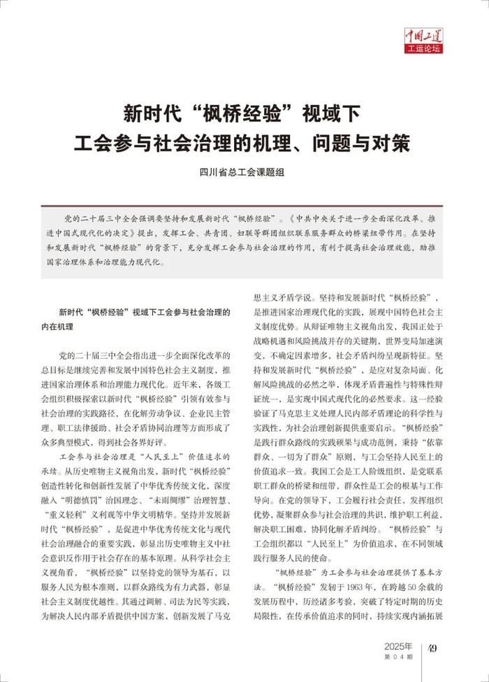 党的二十届三中全会强调要坚持和发展新时代“枫桥经验”,各级工会组织积极探索以新时代“枫桥经验”引领有效参与社会治理的实践路径。四川省总工会课题组研究认为,从内在机理来看,工会参与社会治理是“人民至上”价值追求的承续,而“枫桥经验”为工会参与社会治理提供了基本方法。但是,当前新时代工会参与社会治理仍然面临参与社会治理意识和内生动力不足、参与社会治理的法律法规支撑力度不够和运转经费紧张等问题。