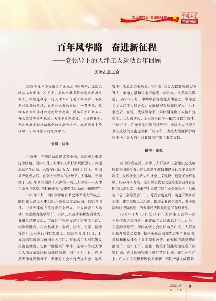 1919年,五四运动浪潮席卷全国,天津成为重要抗争阵地。中国共产党成立后,在李大钊等人的指导下,安体诚、于树德于1921年9月创办了天津第一所工人学校——天津工余补习学校,当时被誉为“天津劳工运动的一道曙光”。1925年8月4日,在中共天津地委领导下,天津总工会举行成立大会。今年是中华全国总工会成立100周年,也是天津总工会成立100周年。回望过去,正是在党的坚强领导下,天津工人运动和工会工作才能在实践探索中,不断取得新的进展和成效,焕发出新的生机和活力。