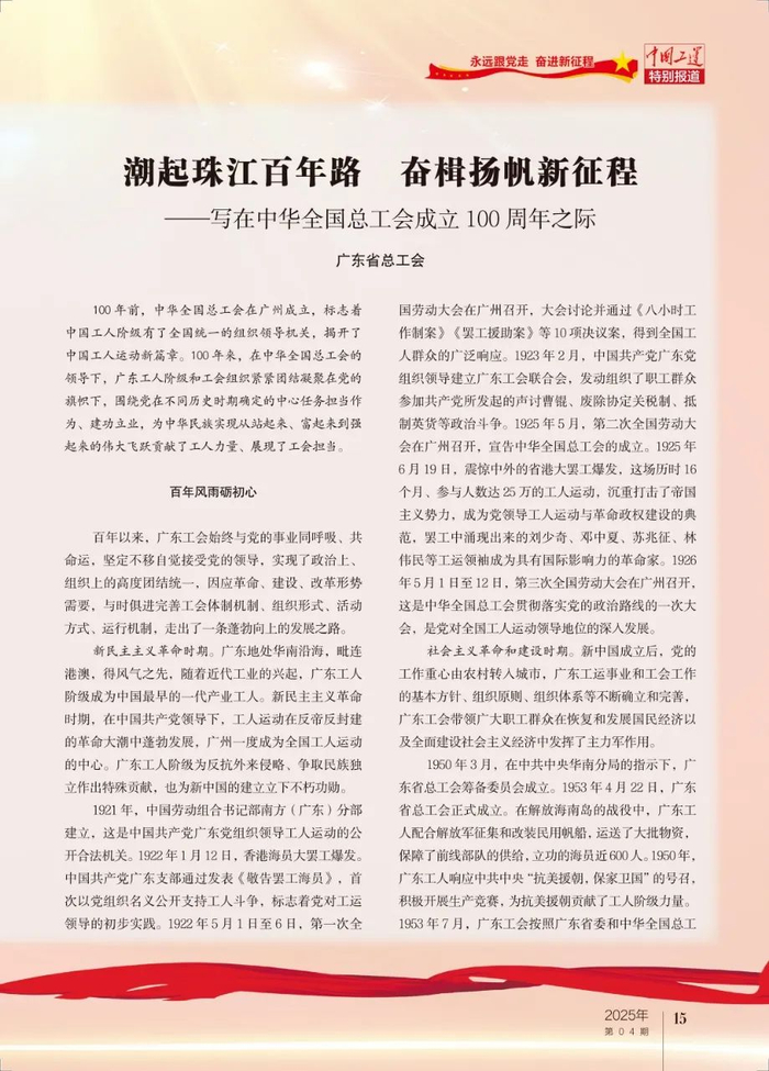 100年前,中华全国总工会在广州成立,标志着中国工人阶级有了全国统一的组织领导机关,揭开了中国工人运动新篇章。100年来,在中华全国总工会的领导下,广东工人阶级和工会组织紧紧团结凝聚在党的旗帜下,围绕党在不同历史时期确定的中心任务担当作为、建功立业,为中华民族实现从站起来、富起来到强起来的伟大飞跃贡献了工人力量,展现了工会担当。