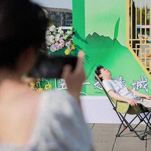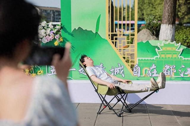 都江堰景区大门口的南桥广场附近,在“都江堰的匠心工位”上,身着蓑衣的熊猫堰工憨态可掬,惬意地躺在躺椅上,吸引众多游客纷纷驻足打卡。游客只需模仿躺着的熊猫,在躺椅上摆出休憩的姿势,便能轻松完成游戏挑战。在这里,游客们既能感受古堰的厚重历史,又能通过轻松的游戏方式留下美好的回忆。