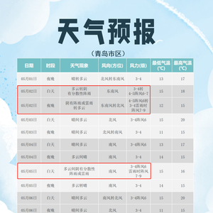 【青岛市区】2日白天多云转阴有分散性阵雨,东南风3到4级转4到5级阵风6到7级,相对湿度30%~80%,2日最低气温13℃,最高气温18℃。
