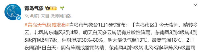 青岛市气象台1日16时发布