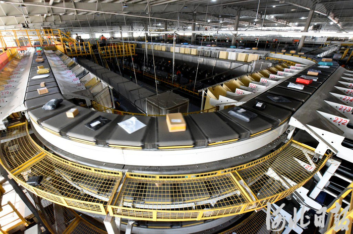 5月1日,位于石家庄市栾城区的申通快递石家庄转运中心,工作人员采用自动分拣系统对快递包裹进行分拣。