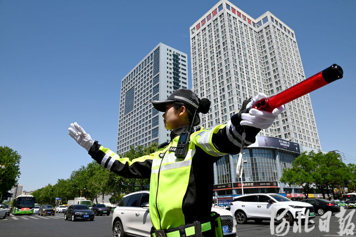 5月1日,邯郸市公安局交巡警支队渚河大队女子中队交警在疏通交通。