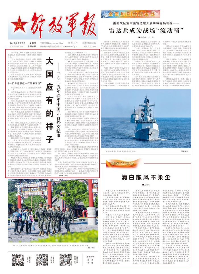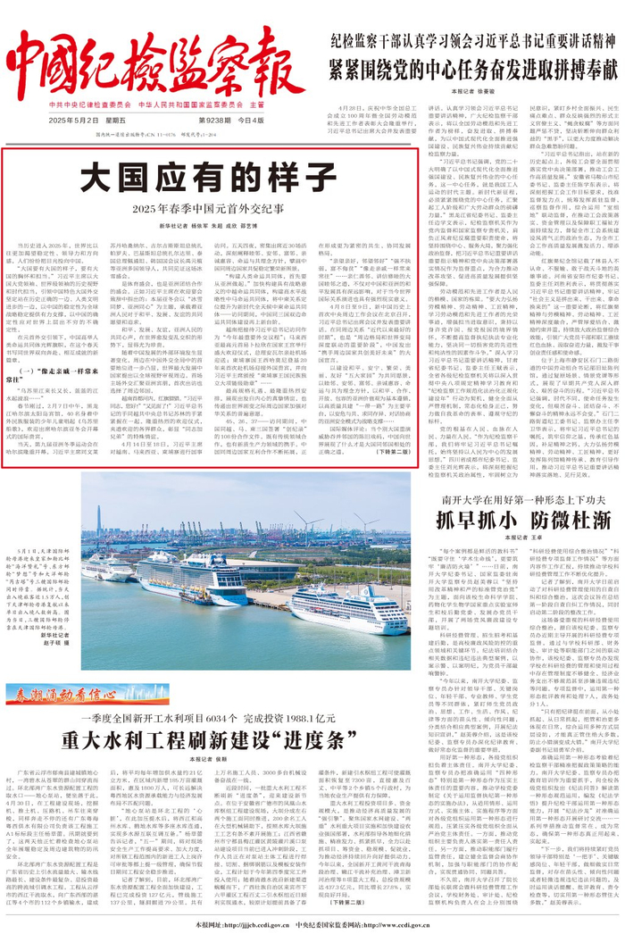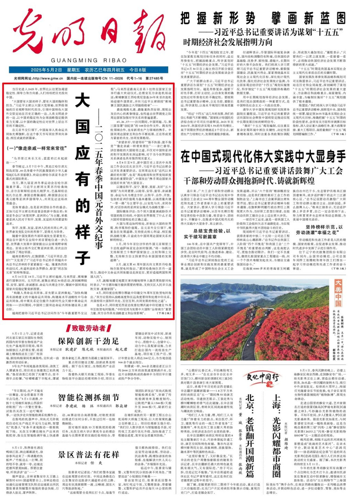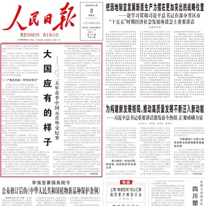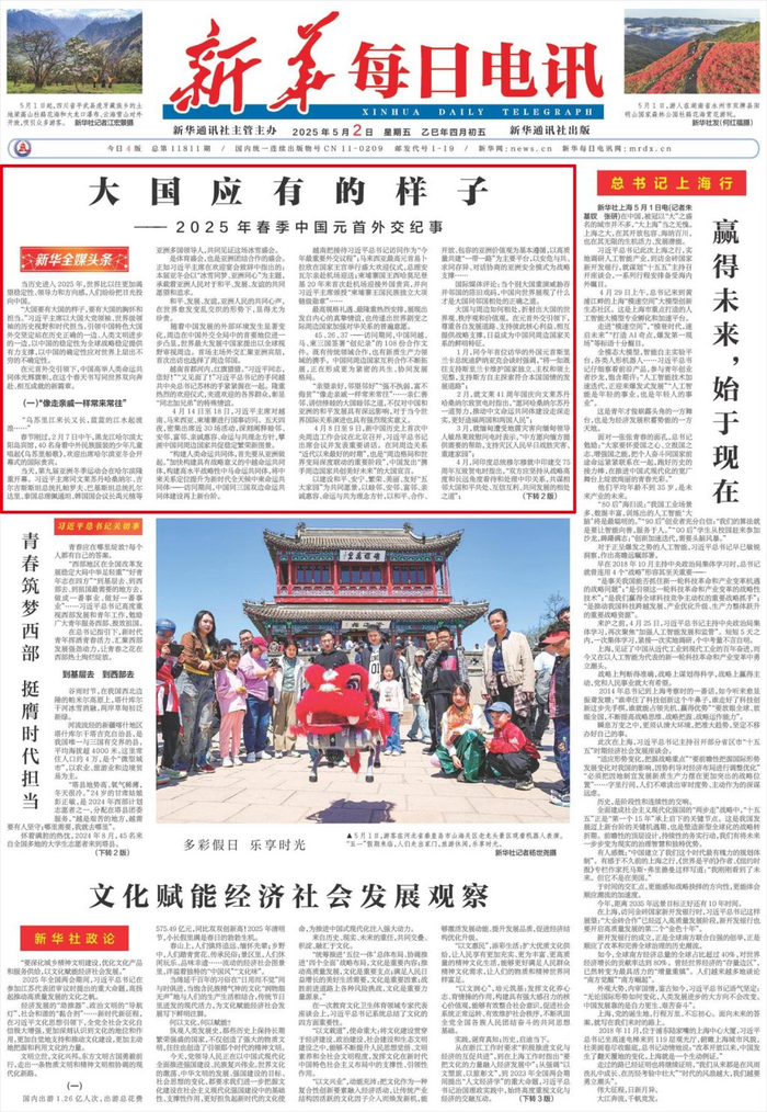 5月2日出版的《人民日报》、《新华每日电讯》、《解放军报》、《光明日报》、《经济日报》、《中国纪检监察报》、《中国青年报》等媒体,均在头版头条位置刊发《大国应有的样子——2025年春季中国元首外交纪事》文章。