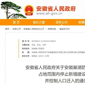 4月30日,安徽省政府网站发布“安徽省人民政府关于安徽巢湖防洪治理工程占地范围内停止新增建设项目并控制人口迁入的通告”,详情如下: