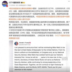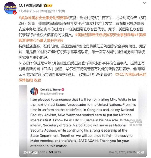 当地时间5月1日下午,北京时间今天(5月2日)凌晨,美国总统特朗普在其社交平台“真实社交”上发文,宣布提名总统国家安全事务助理迈克·华尔兹为下一任美国常驻联合国代表。据悉,美国常驻联合国代表是特命全权大使和内阁级官员。