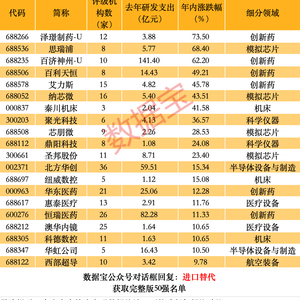 证券时报·数据宝梳理了A股进口替代空间较大的一些行业,包括芯片、光刻胶、科学仪器、医疗器械和航空装备等,并从业绩、机构关注度等角度筛选出进口替代50强股票,以飨读者。