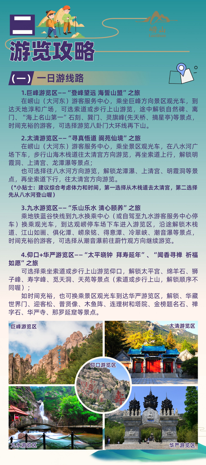 乘地铁4号线在大河东站下车,可直达崂山(大河东)客服服务中心,选乘前往巨峰或太清游览区的观光车。