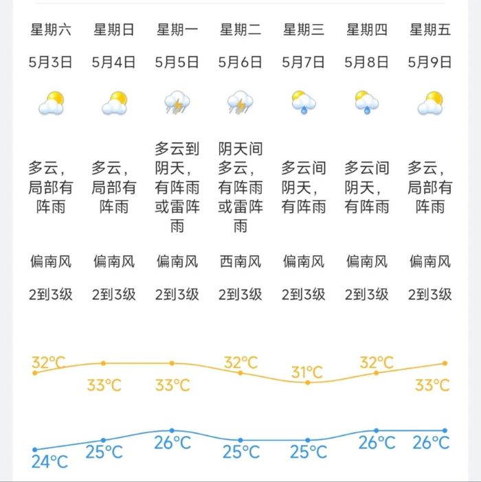 预计5月3日至4日局部有阵雨,5日至8日有阵雨或雷阵雨,9日多云局部有阵雨。目前已进入强对流天气高发期,需注意防御局地强对流天气。