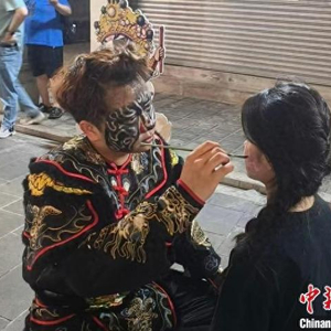 英歌舞队员5月2日在汕头小公园开埠区“学英歌·集五福”活动上为游客免费绘制英歌舞脸谱。 林大森 摄