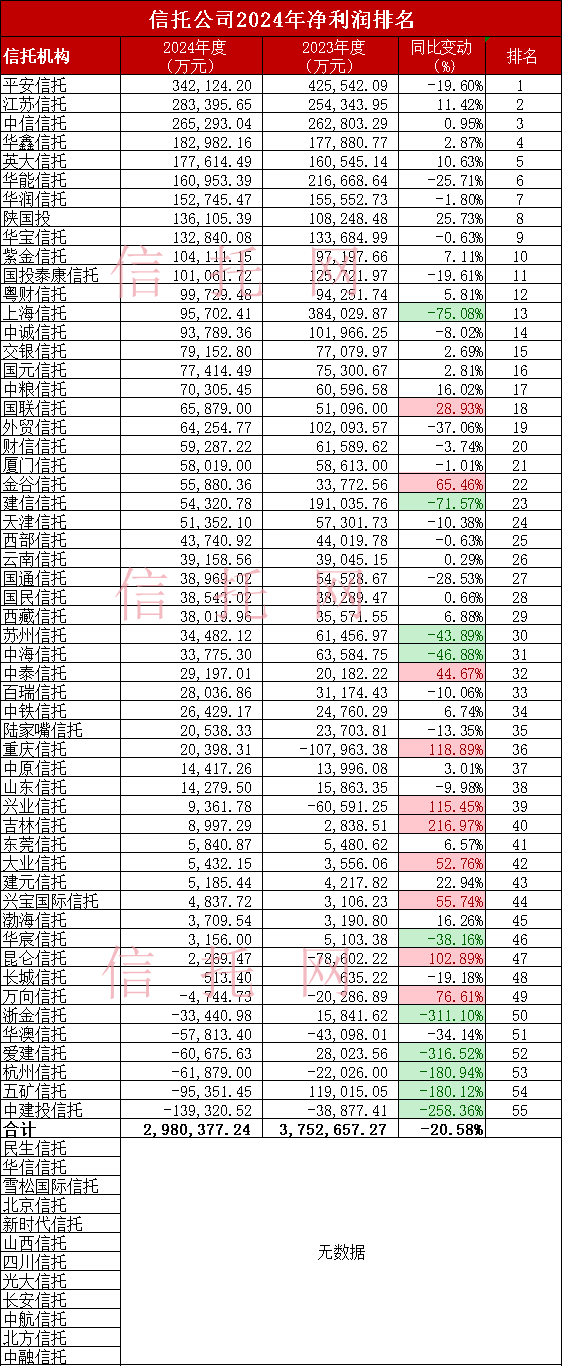 根据信托网整理的年报数据显示,2024年55家信托公司合计净利润2,980,377.24万元,较2023年下降20.58%,行业盈利压力凸显。