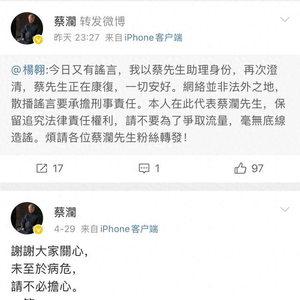 5月1日深夜,蔡澜助理发文:今日又有谣言,我以蔡先生助理身份,再次澄清,蔡先生正在康复,一切安好。网络并非法外之地,散播谣言要承担刑事责任。本人在此代表蔡澜先生,保留追究法律责任权利,请不要为了争取流量,毫无底线造谣。
