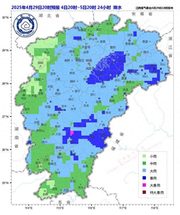 南昌东部、上饶南部、鹰潭北部、抚州北部、吉安东部和赣州北部等地的部分地区有大到暴雨和雷电、短时强降水等对流性天气。