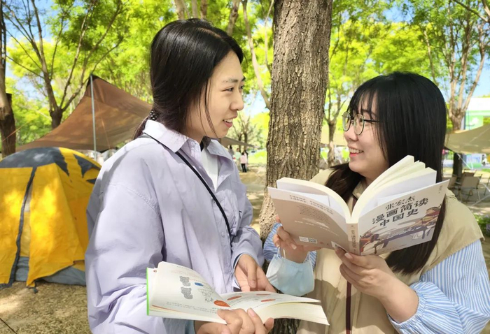 南森书市还特意设置了户外阅读挑战区,十组家庭手捧不同的书籍静坐在草坪上,槐花落满了肩膀。记者了解到,“南森书市”会在每天上午和下午组织两次“沉浸阅读挑战”,现场可以通过扫码报名,每次限十组家庭,每次活动时长一小时,挑战者从指定活动用书中挑选一本进行阅读,期间不看手机即视为挑战成功,可免费获赠精美礼品,边阅读边解锁“薅羊毛”体验。
