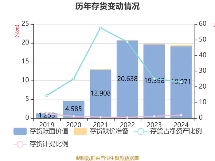 从存货变动来看,截至2024年末,公司存货账面价值为19.07亿元,占净资产的22.93%,较上年末减少5274.06万元。其中,存货跌价准备为3830.64万元,计提比例为1.97%。