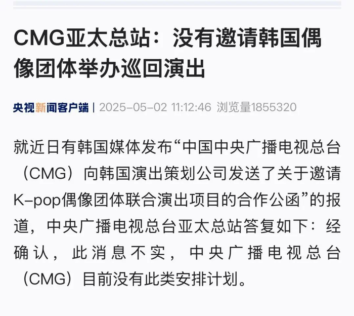 就近日有韩国媒体发布“中国中央广播电视总台(CMG)向韩国演出策划公司发送了关于邀请K-pop偶像团体联合演出项目的合作公函”的报道,中央广播电视总台亚太总站答复如下:经确认,此消息不实,中央广播电视总台(CMG)目前没有此类安排计划。