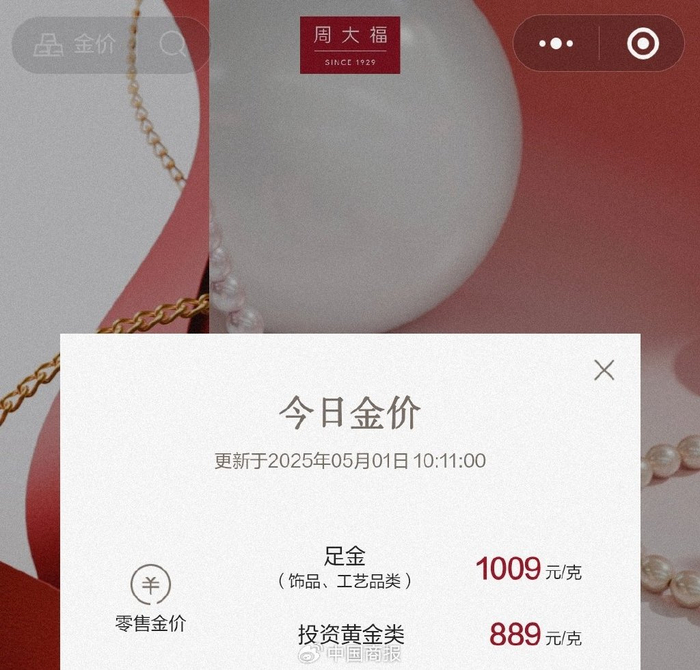 5月1日,周大福足金饰品价格为1009元/克,潮宏基足金(首饰摆件)价格为1009元/克,谢瑞麟足金饰品价格为1009元/克,周生生足金饰品价格为1002元/克,菜百首饰足金饰品价格为995元/克,老庙足金饰品价格为995元/克。