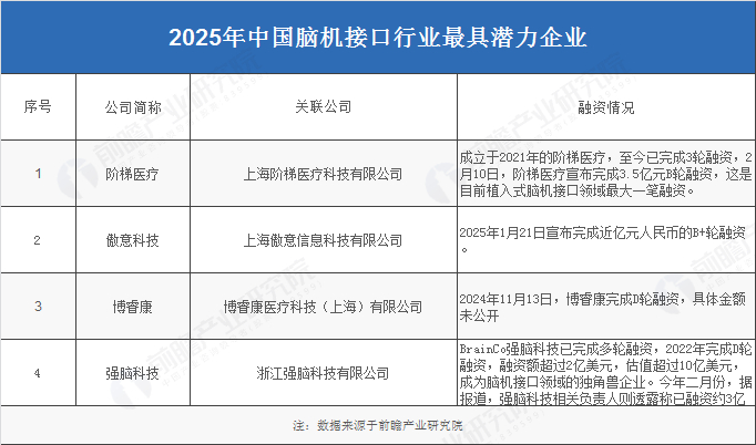 根据前瞻产业研究院报告《2025-2030年中国脑机接口行业发展前景预测与投资战略规划分析报告》整理得出,2025年中国脑机接口行业涌现出一批最具潜力的企业(排名不分先后)。