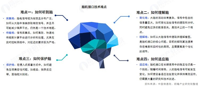 脑机接口技术主要是通过电极采集脑电信号,再借由理解算法分析解读意图并实施反馈给对应的外部设备,而由于脑电信号较为微弱且大脑活动非常复杂,因此“如何听到脑”和“如何理解脑”是现阶段脑机接口技术发展现阶段面临的核心难点。