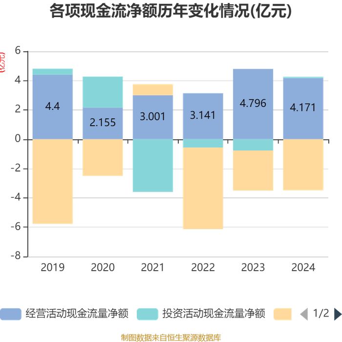 截至2024年,公司经营活动现金流净额为4.17亿元,同比下降13.03%;筹资活动现金流净额-3.49亿元,同比减少7575.62万元;投资活动现金流净额894万元,上年同期为-7693.75万元。