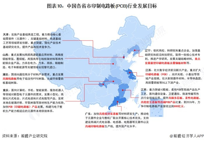 “十四五”期间,我国主要省份也提出了印制电路板(PCB)行业的发展目标,各省市对于覆铜板的发展主要以形成完整产业链和发展高性能、高频高速印制电路板为主。各省市印制电路板行业发展规划如下: