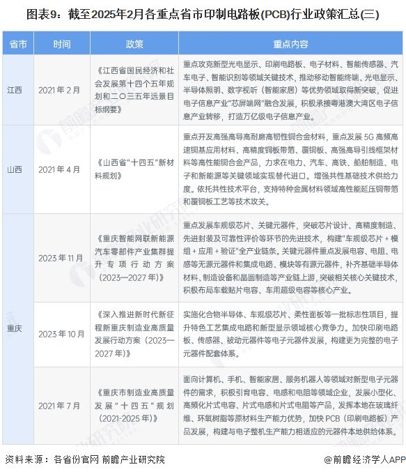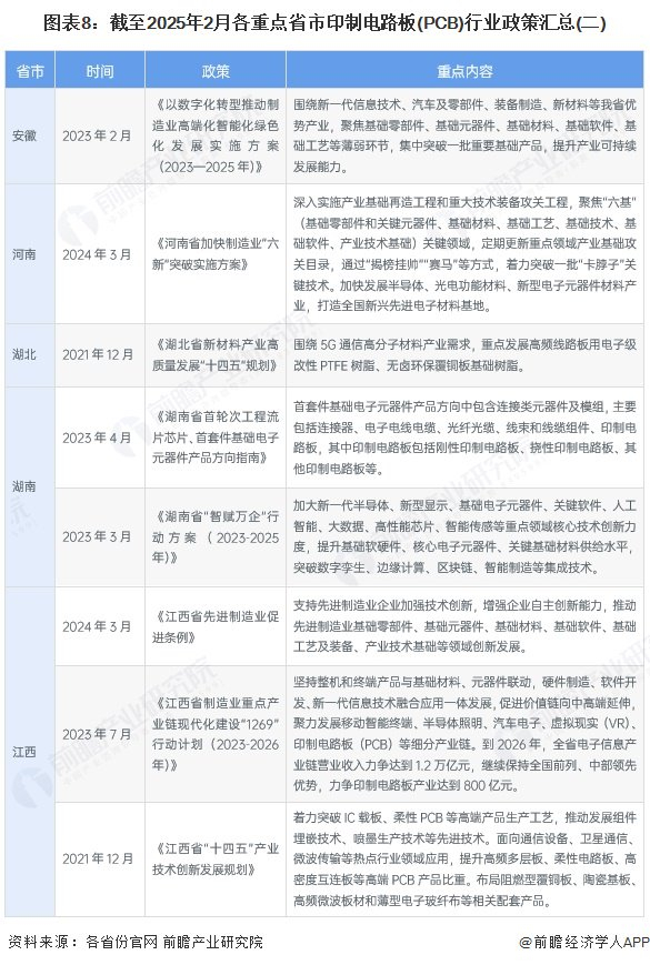 地方政府层面,为了响应国家号召,各省市积极印发有关政策通知推动印制电路板(PCB)行业的发展。截至2025年2月,各重点省市印制电路板行业的相关政策汇总如下: