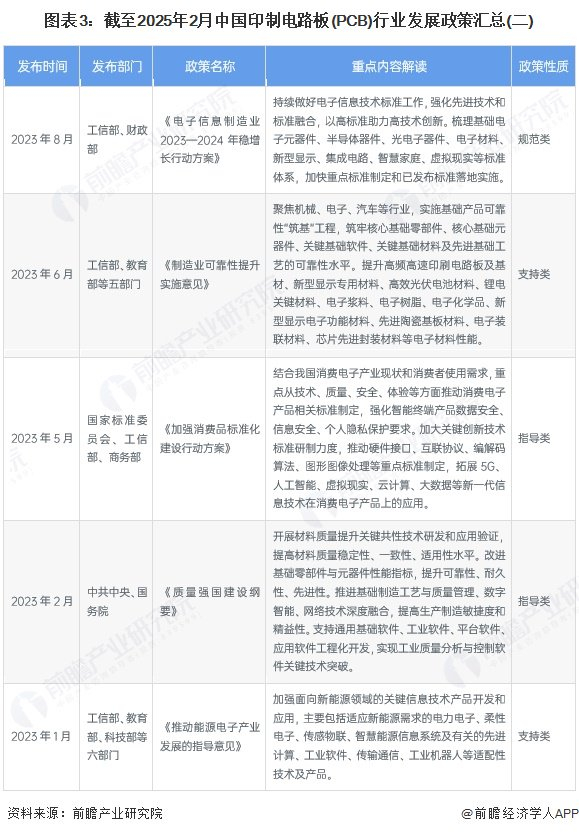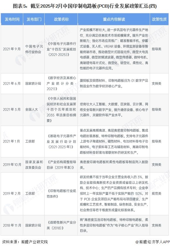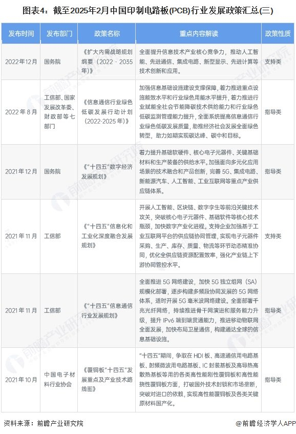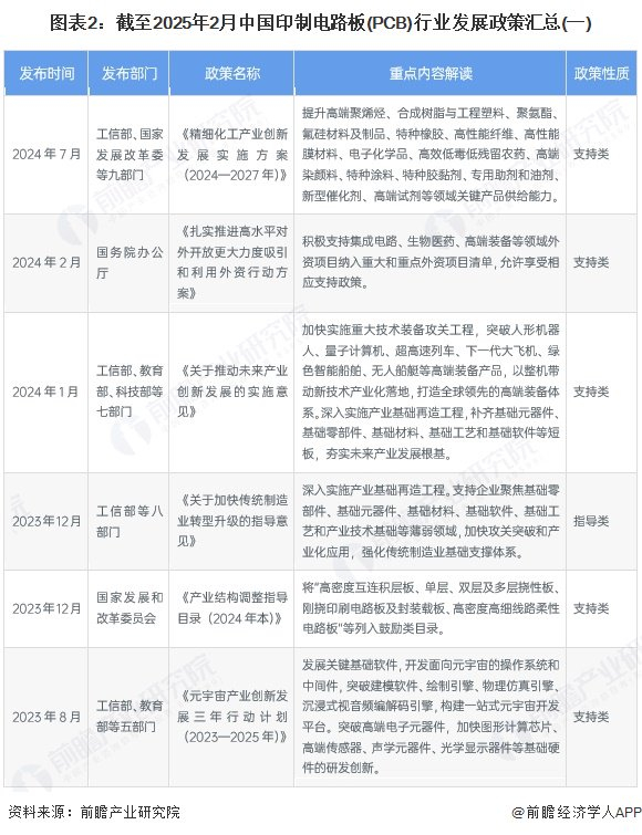 近年来,国家发布一系列政策重点发展高性能、高频高速印制电路板(PCB)产品,同时鼓励行业创新发展,研发新型印刷电路板及覆铜板材料。截至2025年2月,我国印制电路板行业相关政策汇总如下: