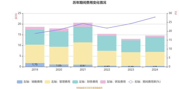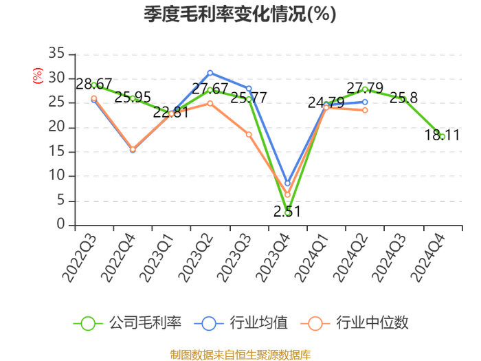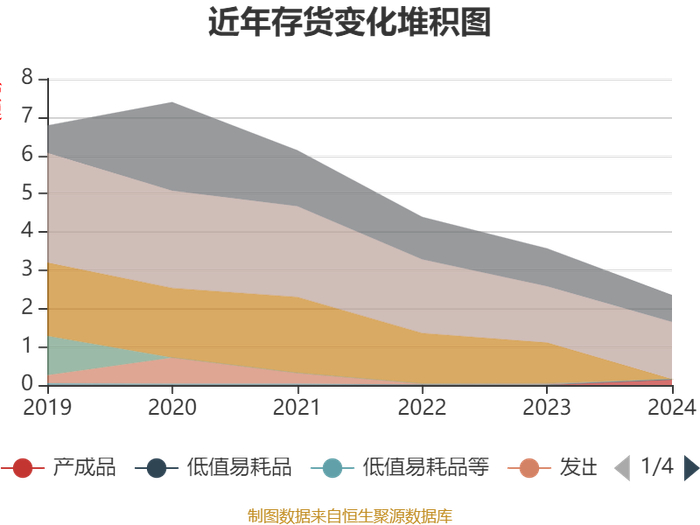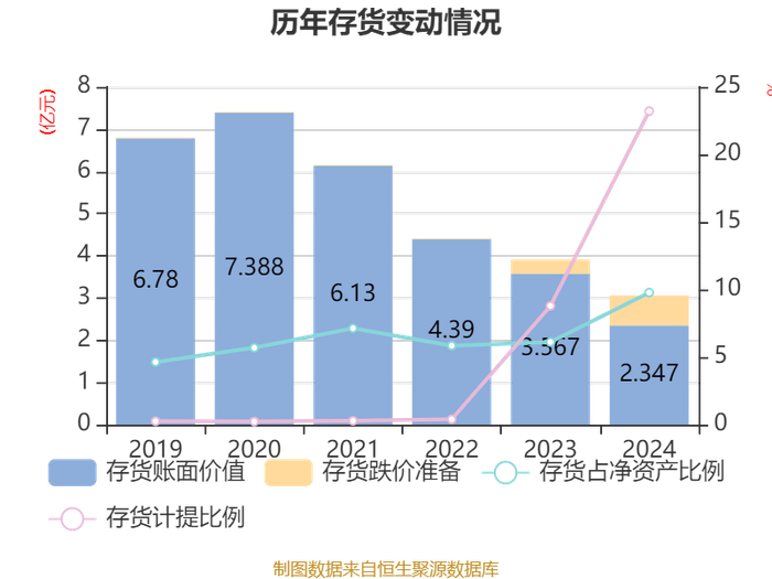 从存货变动来看,截至2024年末,公司存货账面价值为2.35亿元,占净资产的9.77%,较上年末减少1.22亿元。其中,存货跌价准备为7089.43万元,计提比例为23.2%。