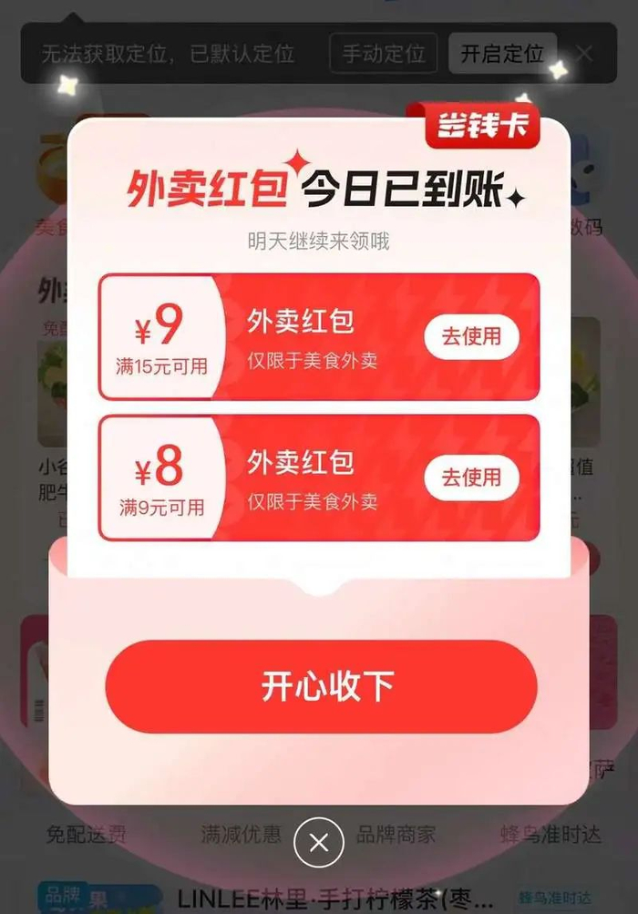 与此同时,记者获得两张开屏红包,分别为满15元减9元红包以及满9元减8元红包。部分品牌店铺也推出店铺红包,如某奶茶品牌推出满12元减12元的券。记者用4元成功购入一杯标价为17元的网红栀子花味奶茶。