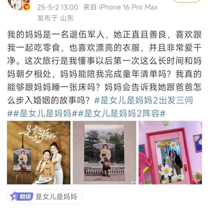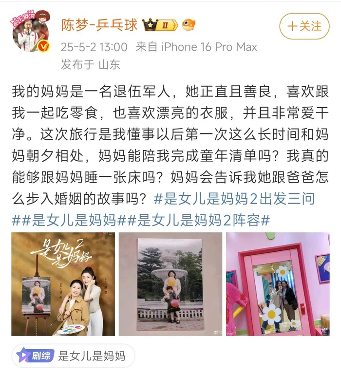 5月2日,国乒运动员陈梦官宣新综艺《是女儿是妈妈2》,自曝“妈妈是一名退伍军人”:她正直且善良,喜欢跟我一起吃零食,也喜欢漂亮的衣服,并且非常爱干净。这次旅行是我懂事以后第一次这么长时间和妈妈朝夕相处,妈妈能陪我完成童年清单吗?我真的能够跟妈妈睡一张床吗?妈妈会告诉我她跟爸爸怎么步入婚姻的故事吗?