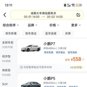 同样是GL8车型,在成都火车南站的日租价格则便宜了些许,日租价格为698元。并且该站点可租车型还有35款,其中丰田雷凌的日租价格为348元。值得一提的是,该地明显新能源可选车型较为丰富,小鹏汽车理想汽车特斯拉与方程豹均有供应,日租价格在500元—900元之间。
