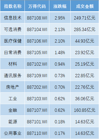 从行业角度来看,Wind香港一级行业指数中,11个指数全部上涨。从涨幅看,表现最好的三个指数为信息技术、可选消费、医疗保健,涨幅分别为2.95%、2.13%、2.10%;公用事业、能源、工业等虽然排名靠后,但同样实现收涨,涨幅分别为0.17%、0.18%、0.62%。