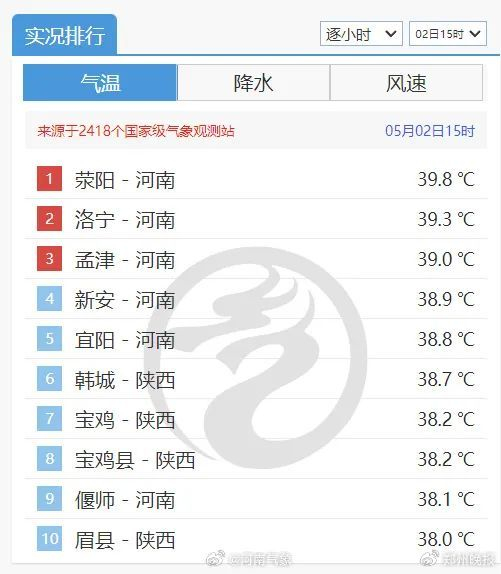 今天下午3时,郑州荥阳39.8℃,在全国气温榜继续领先,前五名河南全部拿下。