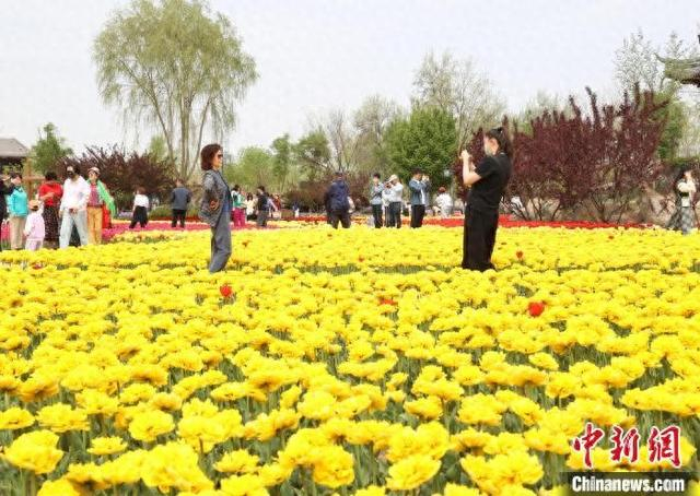 5月2日,宁夏银川市兴庆区海宝公园的郁金香竞相绽放,吸引众多游客前来观赏“打卡”。中新社记者 于晶 摄
