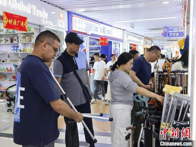 5月2日,外商(左一)正选购商品。“五一”假期期间,浙江义乌国际商贸城正常营业,不少商户特意开放零售渠道,以迎接假期的大客流。中新社记者 鲍梦妮 摄