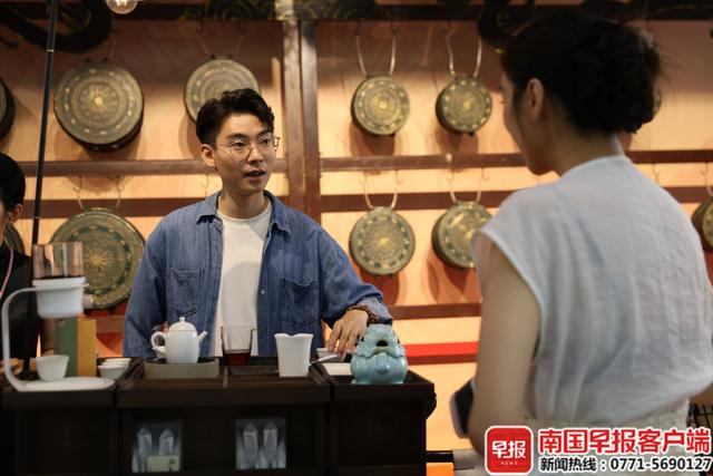 中庭广场上,背篓接绣球、板鞋竞速接力赛让游客们在欢声笑语中感受劳动人民的智慧结晶。广东游客李先生全家上阵,玩得满头大汗仍意犹未尽:“这样的民俗特色项目太有意思了!”在二楼的铜鼓戏台,“流浪茶摊”飘出阵阵茶香,茶艺师用现代手法冲泡六堡茶,不少游客举着茶汤拍照发上社交平台分享喜悦。