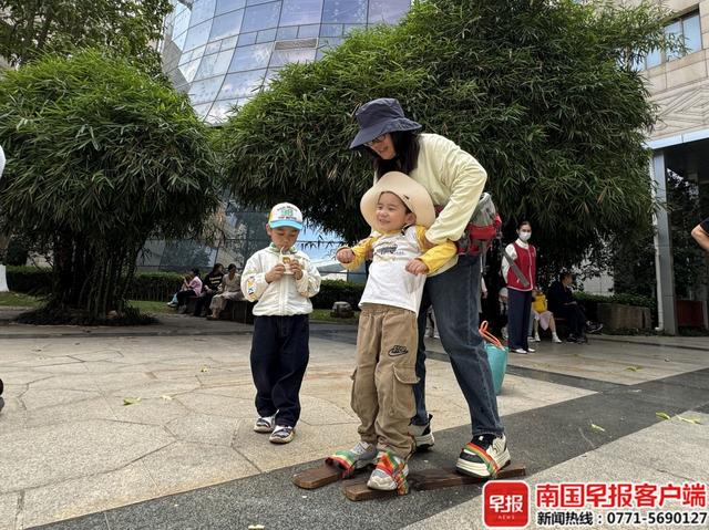 5月2日,广西民族博物馆内,大朋友和小朋友玩板鞋游戏。