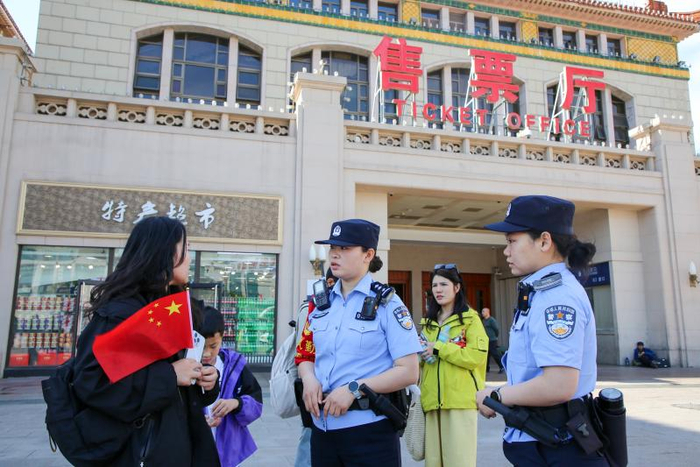 据介绍,“五一”前夕,北京铁路公安处在管内积极组织开展了“平安铁路—2025”专项工作,通过“日间多清、夜间大清”等多波次治安集中清查,严密管内阵地防控。对倒卖车票、黑车招揽、“贴靠”进出站等惯性治安问题进行打击。同时,还加强进出站口、广场、售票厅、候车室等部位警力部署,最大化把警力摆在面上,有效提升防控“见警率”和“管事率”。除了加强客流集中的北京、北京西、北京南等七大火车站警力部署外,还加强对北京周边的张家口、廊坊、承德南、涿州东等高铁站治安秩序维护。此外,针对北京郊区的八达岭、八达岭长城、延庆、怀柔、雁栖湖、古北口等旅游车站,还组织沿线相关车站派出所加大警力投入,并结合客流乘降特点,加强站区重点部位盯守巡查,维护好旅客乘降车秩序。