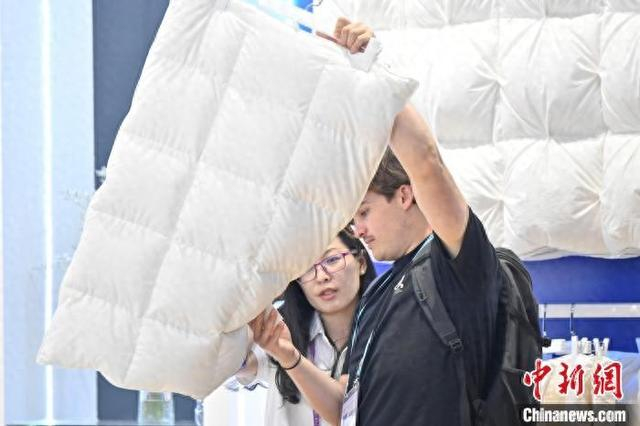 5月2日,广交会境外采购商(右)在家用纺织品展区挑选产品。正在广州举行的第137届中国进出口商品交易会(广交会)第三期以“美好生活”为主题,展出五个专业板块,共21个展区。其中家用纺织品板块展览面积6.57万平方米,展位3168个,吸引1649家企业参展。中新社记者 陈骥旻 摄