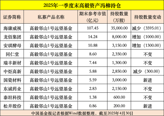 高毅资产资深基金经理冯柳掌舵的高毅邻山1号远望基金在今年一季度末现身10家上市公司的前十大流通股东名单。