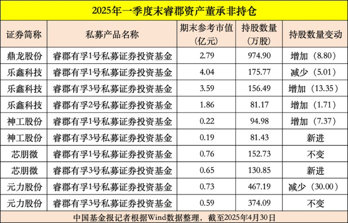 睿郡资产首席研究官董承非管理的私募基金在今年一季度继续加仓半导体芯片行业标的,比如小幅加仓乐鑫科技,持股增至413.43万股,期末持有市值为9.49亿元;还增持了芯朋微,持股增至283.58万股,期末持有市值为1.41亿元。