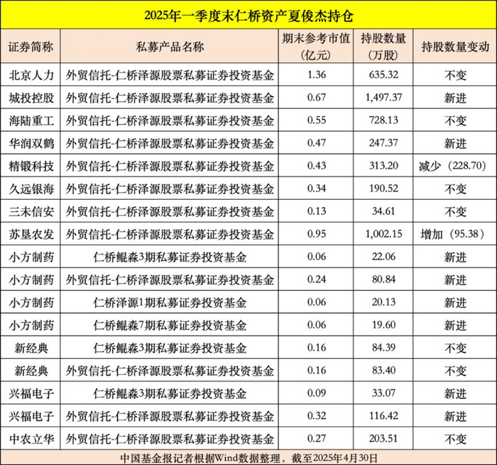 仁桥资产掌门人夏俊杰在今年一季度也有不少调仓换股动作,比如新进城投控股1497.37万股,期末持有市值为6700万元。