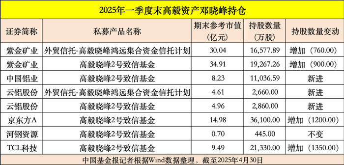 2025年一季报显示,高毅资产首席投资官邓晓峰大举加仓多只有色金属股票,比如两只产品一起增持紫金矿业共1660万股,一季度末持有3.58亿股,期末持股市值为64.95亿元。事实上,去年四季度邓晓峰就加仓了紫金矿业近722万股。
