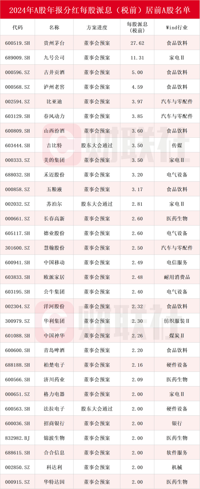 wind数据显示,贵州茅台以每股派27.62元位列2024年A股年报分红榜榜首。