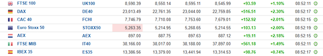 目前正在交易的欧洲股市集体走高,德国DAX指数现涨2.30%,英国富时100指数涨1.10%,法国CAC40指数涨2.01%,欧洲斯托克50指数涨2.00%。