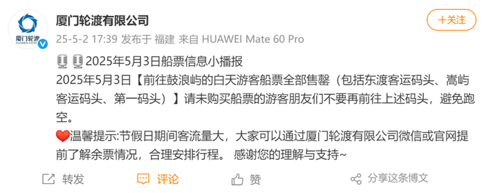 据厦门轮渡官方微博消息: