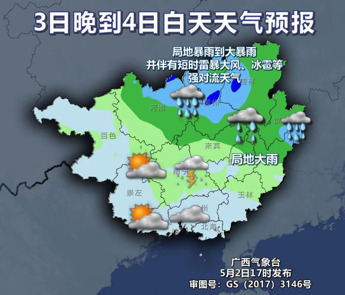 3日晚上到5日白天,桂北部分地区有中到大雨、局地暴雨到大暴雨并伴有短时雷暴大风、冰雹等强对流天气,其他地区多云间阴天有阵雨或雷雨、局地大雨。