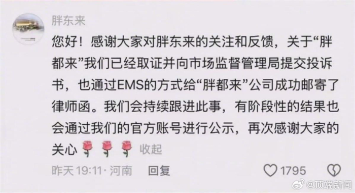 1日,有网友发布的一则截图显示,胖东来账号留言称,感谢大家对胖东来的关注和反馈,关于“胖都来”,他们已经取证并向市场监督管理局提交投诉书,也给“胖都来”公司成功邮寄了律师函。胖东来方面会持续跟进此事,有阶段性的结果也会通过他们的账号进行公示。